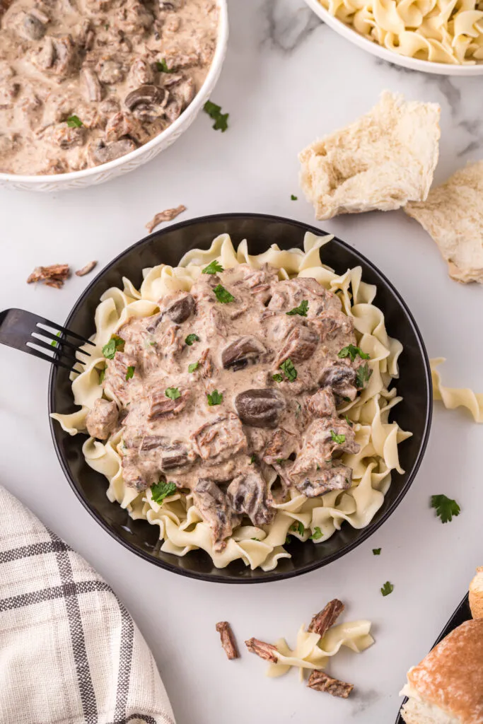 - Serve: Serve the beef mixture over the Stroganoff noodles and garnish with fresh parsley.