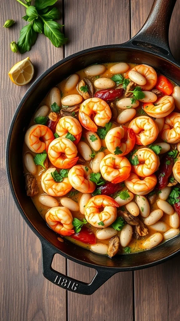This Shrimp & White Bean Skillet is a delightful dish that combines the sweetness of shrimp with the creamy texture of white beans. The vibrant colors of the shrimp and beans pop against the rustic wooden background, making it as pleasing to the eye as it is to the palate. Fresh herbs like basil and cilantro add a burst of flavor, while a hint of lemon brings brightness to the dish.